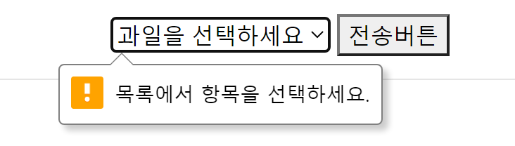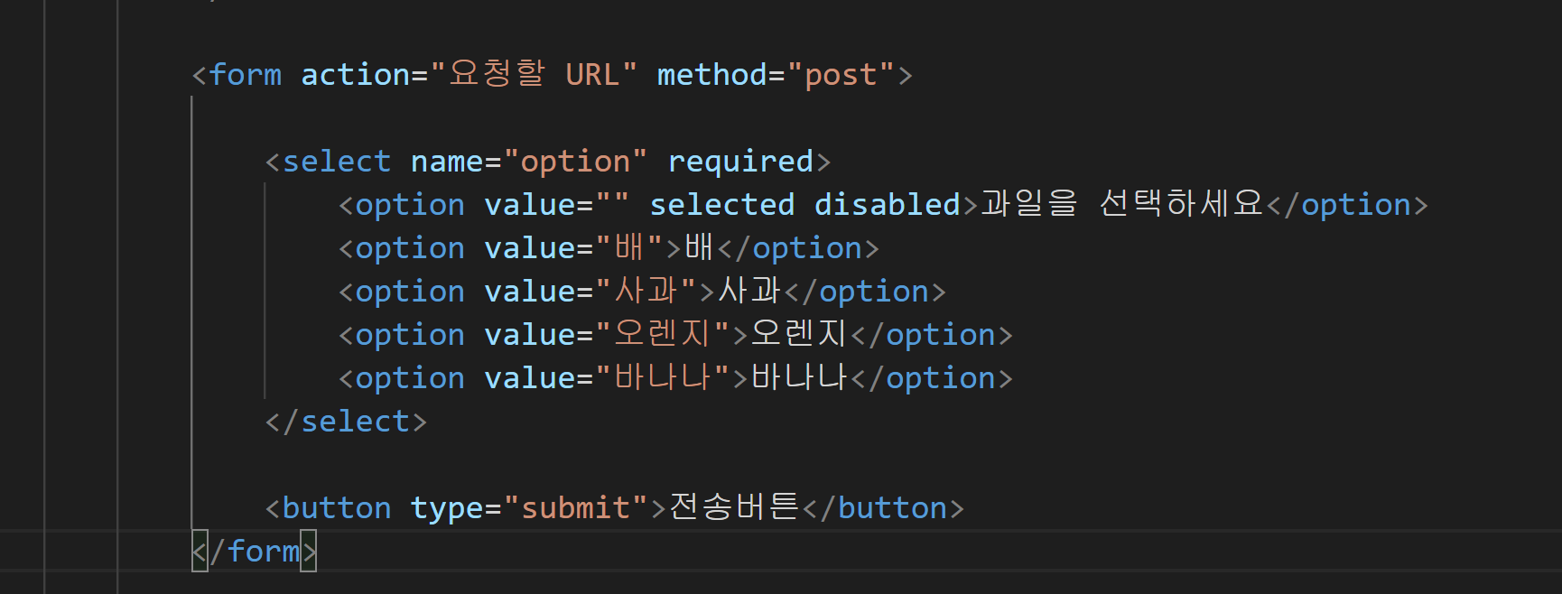위 코드와 같이 select 태그에 required 속성을 주고 option 태그들 중 디폴트 값을 하나 만든다.